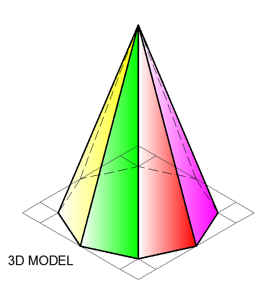 Creates a 3d solid pyramid. By default, a pyramid is defined by the center of the base point, a point on the middle of the edge, and another point that determines the height. Set the number of sides. A pyramid is said to be tetrahedron (triangular base), square pyramid, hexagonal pyramid etc, according to the number of sides of the polygon that form the base.